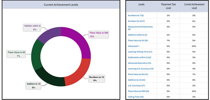 The table to the right shows that 54% of students are in the Advanced math levels. Approximately, half of the Kindergarteners in this school are 1st grade math ready. There are two months of instruction remaining to work with students to meet the school's math achievement goal.