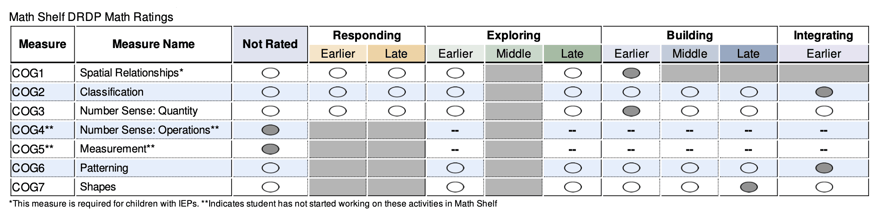Below is an example of a Math Shelf DRDP student report. Students that are Math Kindergarten Ready score in the Integrating Earlier category for each of the 7 COGMath ratings.