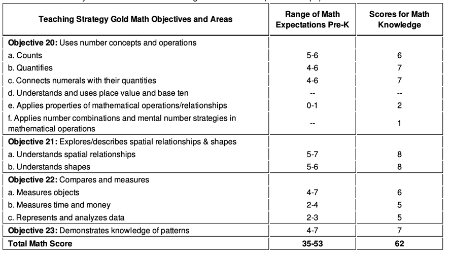 In the Math Shelf Teaching Strategies Gold Report, children that are Math Kindergarten Ready have a total math score between 35 and 53. As this example shows, teachers can view student skills and knowledge ratings for each math objective, and the total math score.