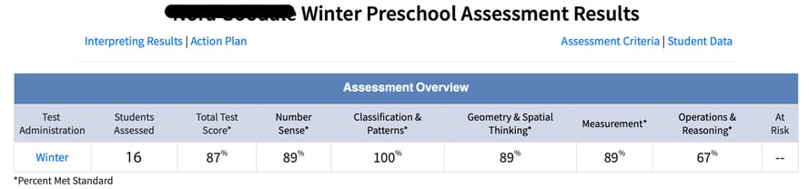 In this PreK class, 16 students completed the Winter Assessment. The Total Test Score indicates that 87% of students met standard. Students performed well on each of the math subtests (Number Sense, Classification & Patterns, etc.), however, only 67% of students met standard for Operations & Reasoning.