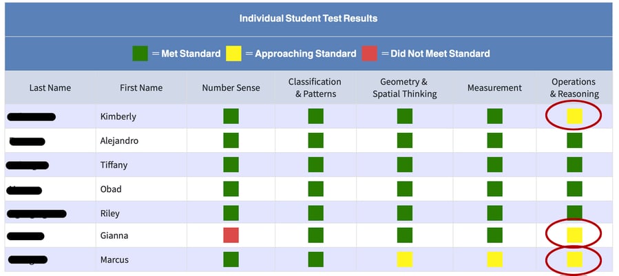 When teachers analyze individual student assessment results (shown below), they can see which students need support, and which math content to focus on. In the example below, students Kimberly, Gianna, and Marcus need to work on Operations & Reasoning.