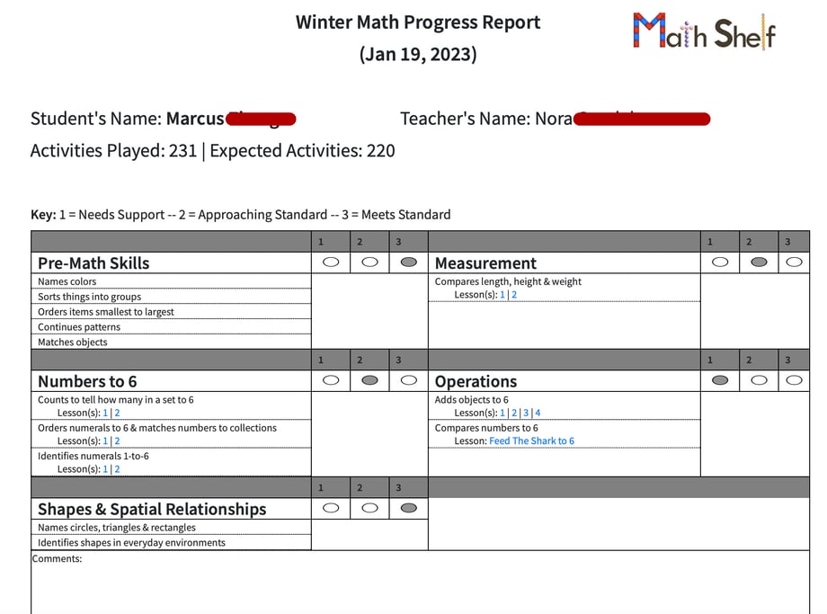 - When children complete all 5 assessment parts, the teacher can review results in his/her Math Shelf Dashboard.